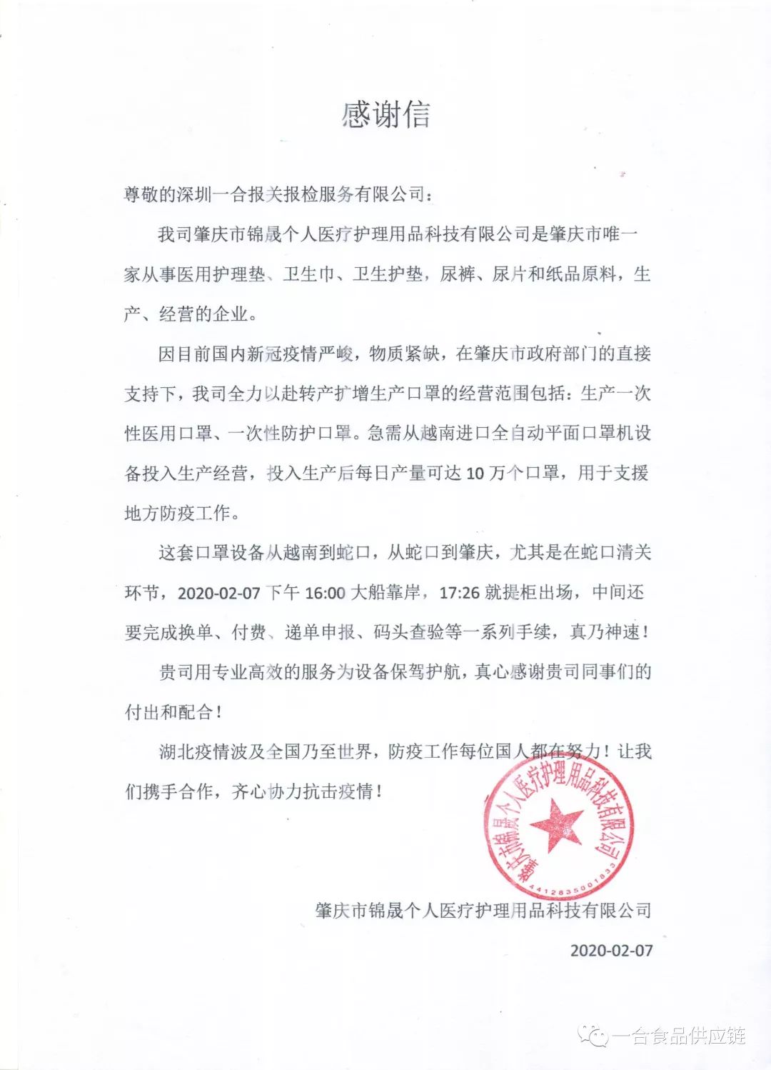 來自廣東省肇慶市錦晟個人醫療護理用品有限公司的感謝信
