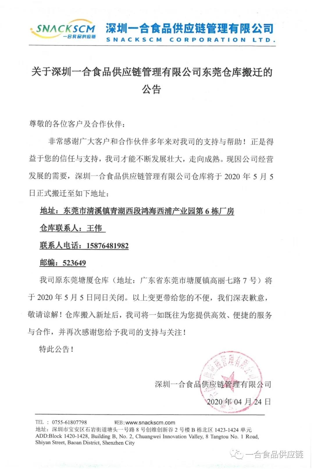 關于深圳一合食品供應鏈管理有限公司東莞倉庫搬遷的公告